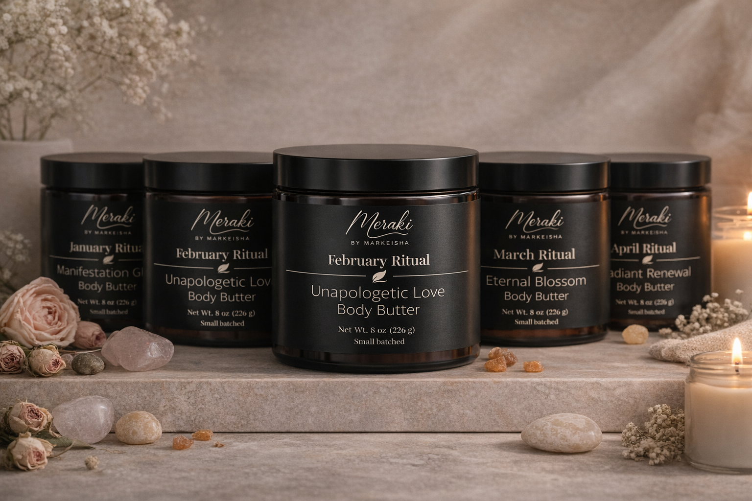A monthly, small-batch body butter featuring a one-time scent designed as a ritual—not a routine. Deeply moisturizing, intentionally crafted, and available in limited quantities only.